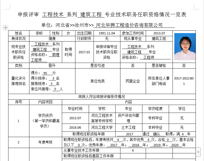 李昕申报评审工程技术系列建筑工程专业技术职务任职资格情况一览