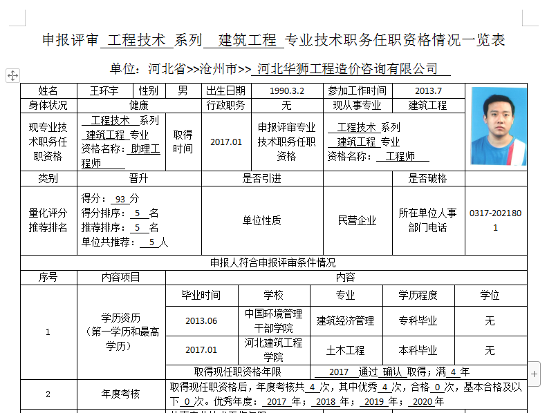 王环宇申报评审工程技术系列建筑工程专业技术职务任职资格情况一