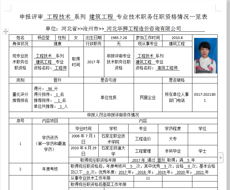 杨亚莹申报评审工程技术系列建筑工程专业技术职务任职资格情况一